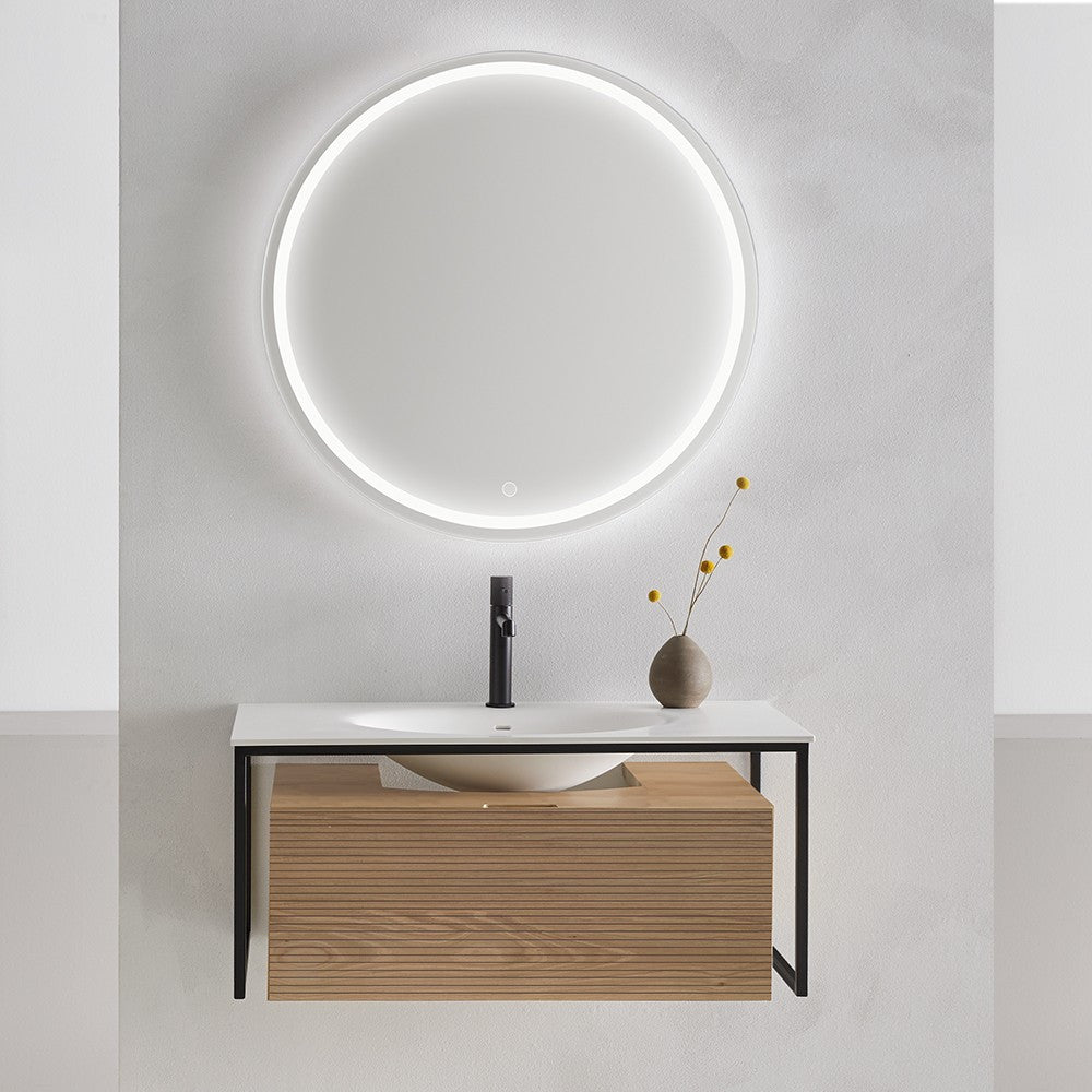Un jeu de matières souligné par une structure en métal laqué noir. Chaque détail est soigné, plan vasque en Solid surface affleurant le meuble, façade cannelée dotée d'une prise de main discrète, choix de finition unique. En bois massif aux reflets ambrés pour le chêne, tons chocolat pour le noyer ou en version laquée amande ou gris aloé poudré.